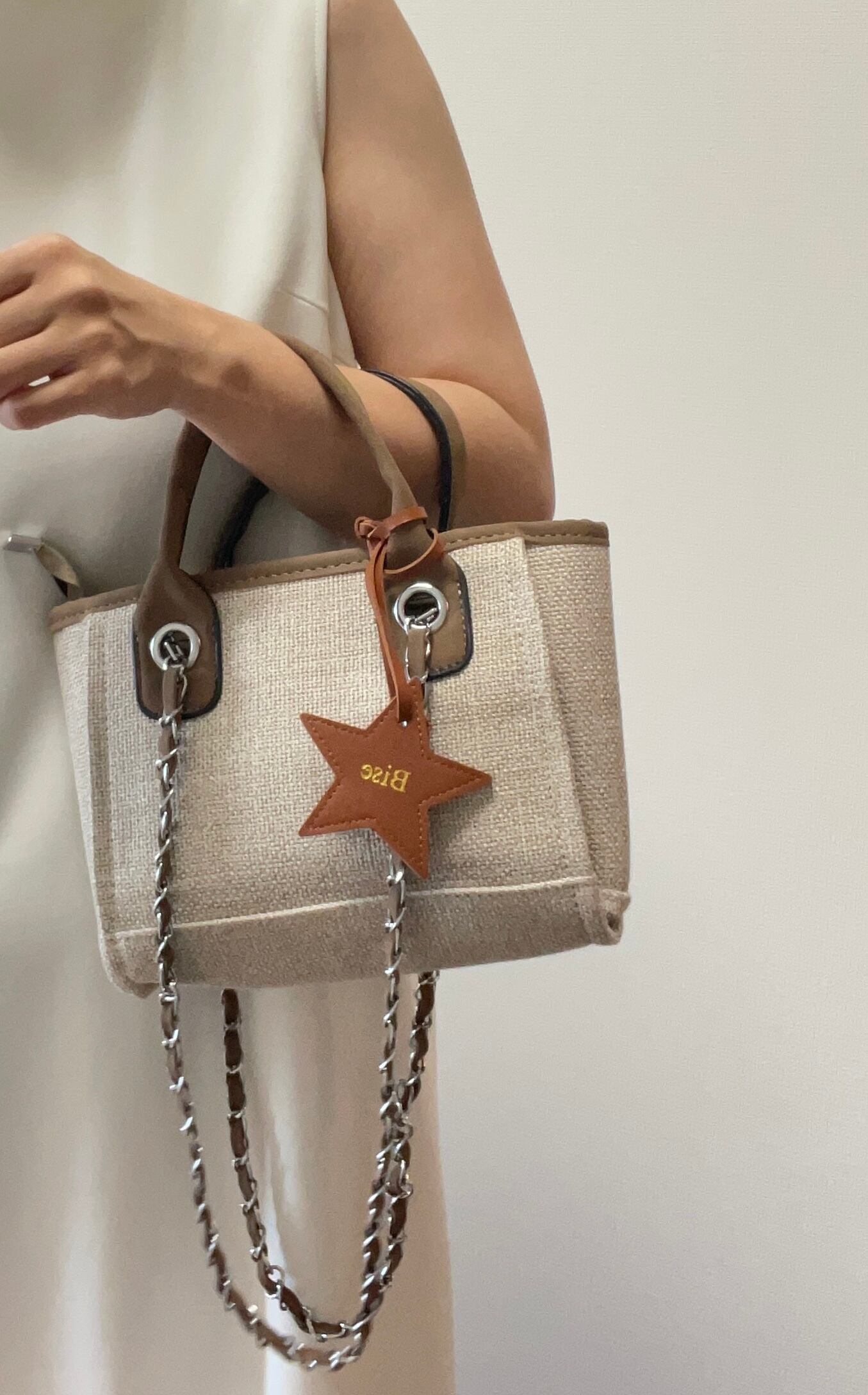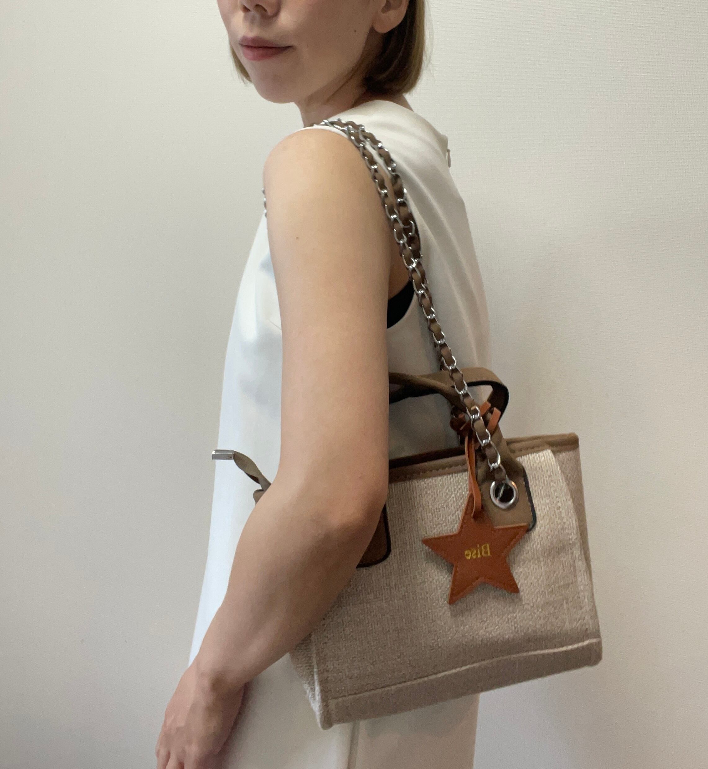 上質なキャンバス地にチェーンの輝きを添え、Biseらしいチャームでアクセントを効かせました。