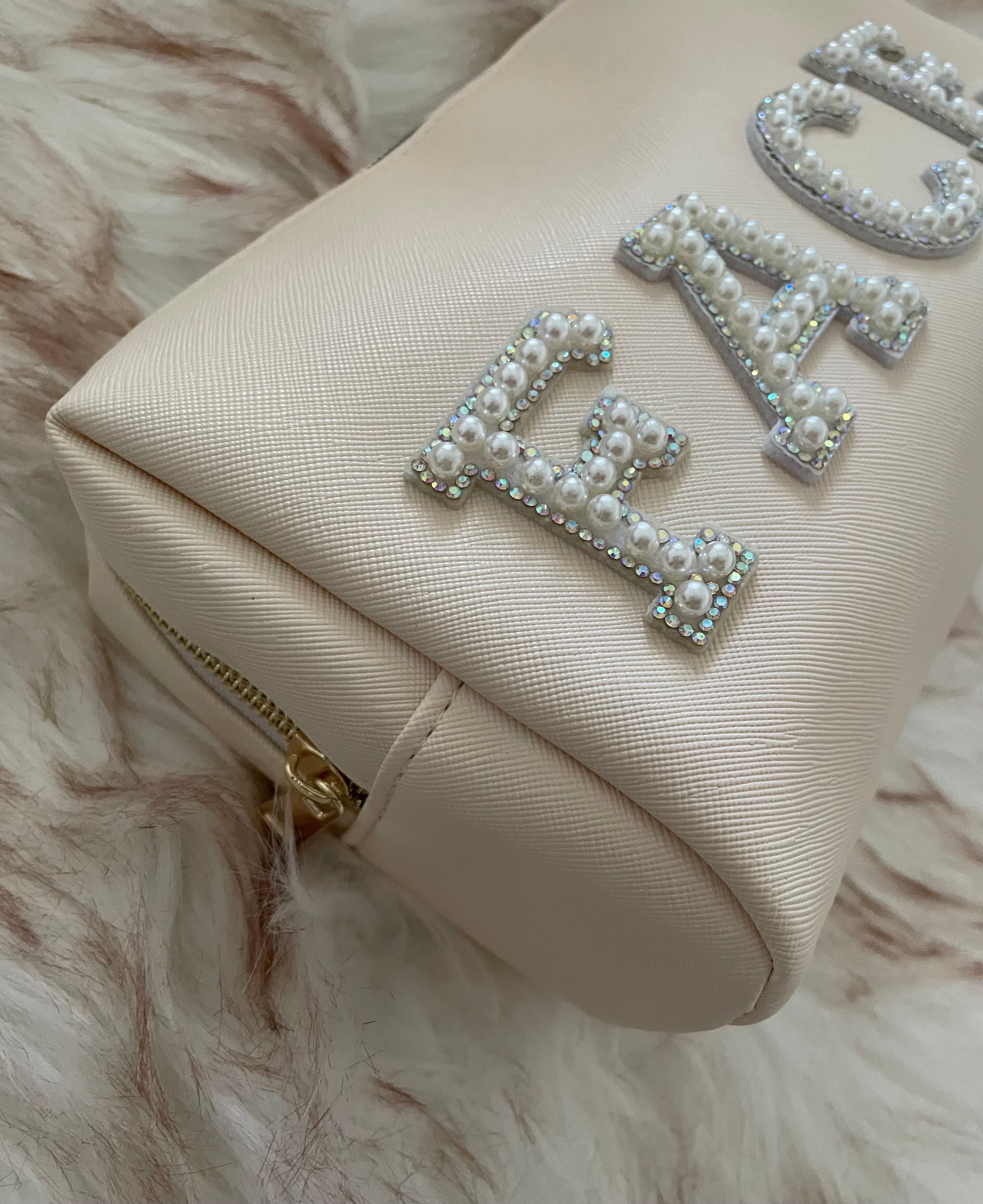 化粧水や美容液などを入れるスキンケア専用のポーチです。パールを付けました。